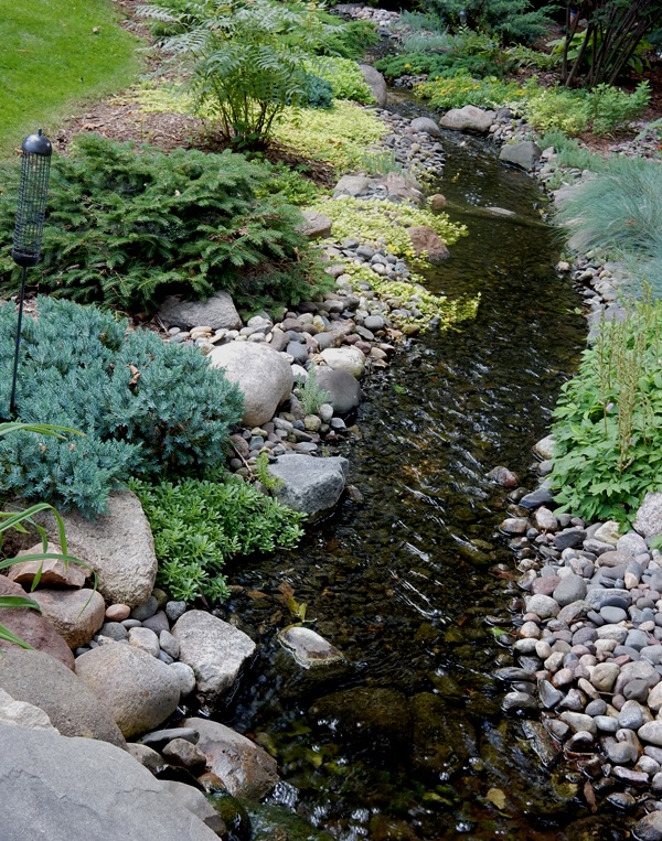 Linda has a particular interest in conifers, but this varied garden includes ferns, hostas, and colorful annuals, but the real showstopper is the 100 foot long stream that sings its way down the slope, framed by low evergreens, golden creeping jenny and ferns on either side. This man-made stream depends on a concrete base that is hidden by the artful arrangement of stones. Like Dianne with her lotus pond, Linda had a lot of advice about the necessity for good concrete work.