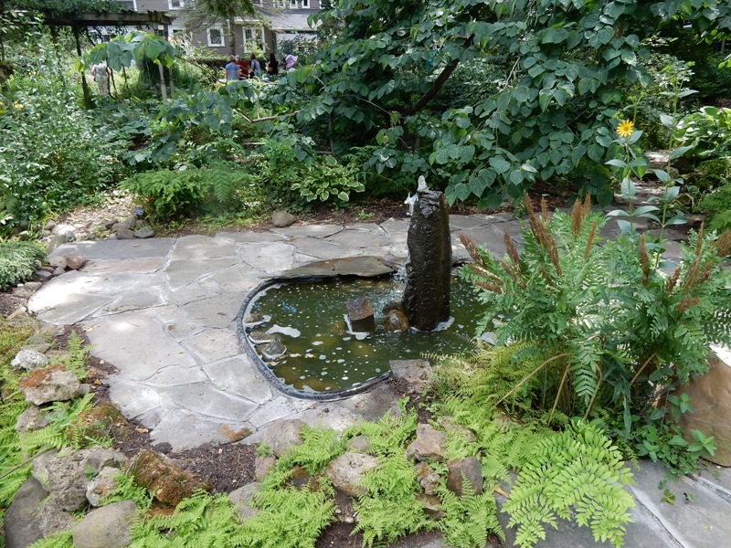 Ruth is a member of the Wild Ones organization whose goal is to educate and advocate for the necessity of native plants in home gardens. In that spirit Ruth had lots of labels on her mass native plantings to attract pollinators. Her small stone lined pool with its spouting shower fountain made a delightful cooling sound. Ruth said it was important to her to have a fountain that she could listen to. A pool like this is now within the reach of almost anyone because of the magic of electrical recirculating pumps.