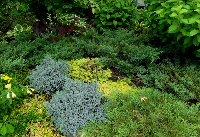 Moore told me that most of her evergreens are junipers, with a few pine and cypress. “The low ones along the walk are a combo of Nana juniper, Blue Rug juniper, Siberian cypress, and another (nameless) crawler, a very nice light green.”