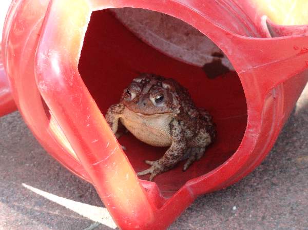 Diane – That was one big toad. The watering can was upright when he jumped in. I don’t know how he did that.
